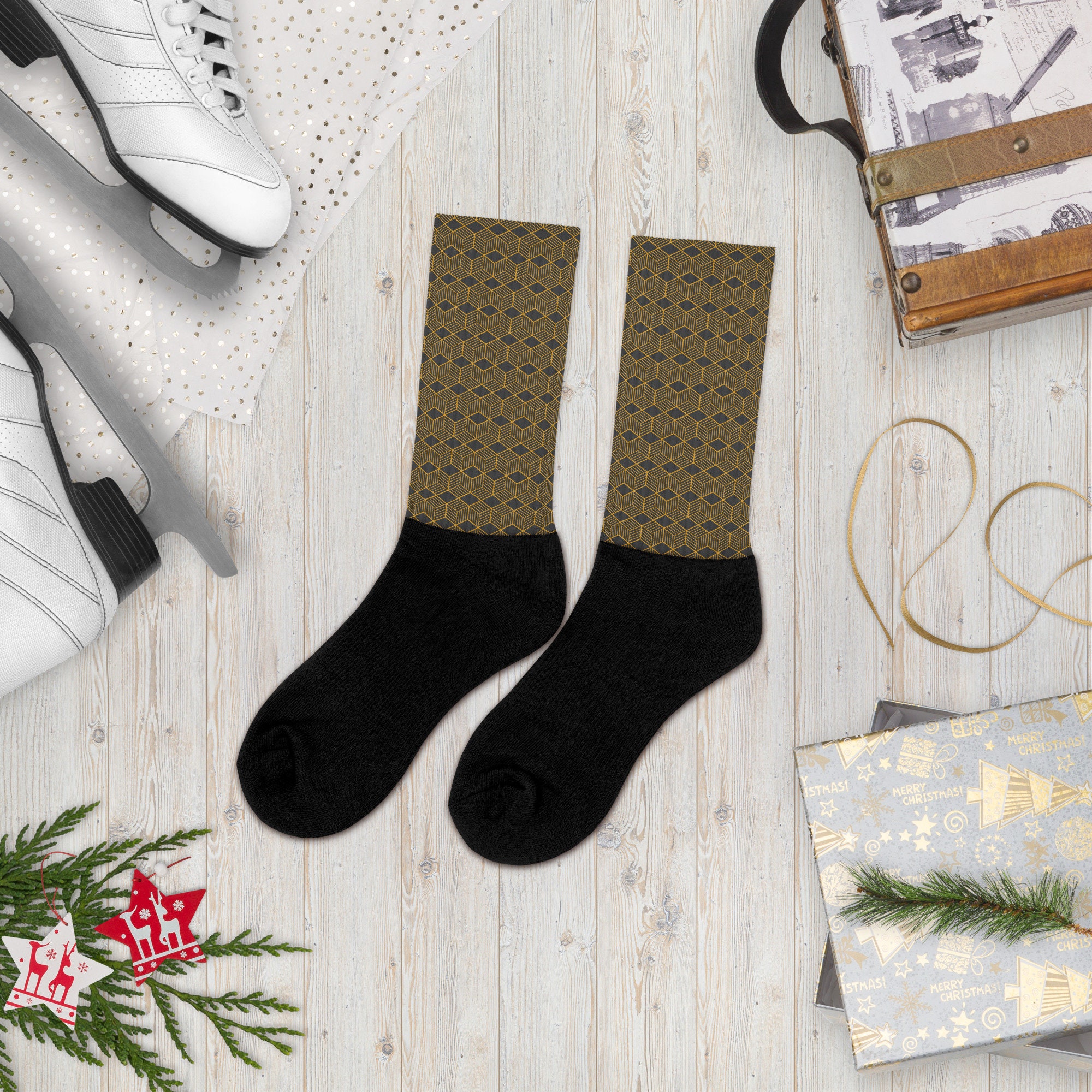 These socks are extremely comfortable thanks to their padded bottom. They are black at the foot, with printed patterns in bright and vibrant colors along the leg.